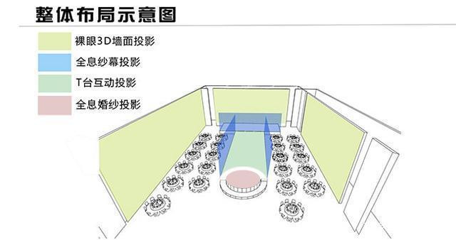 顧名思義,婚紗投影就是在新娘的婚紗上進(jìn)行全息投影,達(dá)到具有動(dòng)態(tài)美的“百變新娘”效果,是全息宴會(huì)廳最受觀眾喜愛的部分。新娘只需要穿上婚紗站在投影區(qū)域即可。